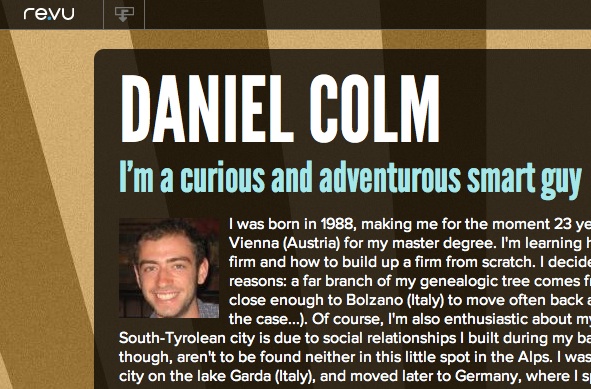 Recentemente ho scoperto tramite Piero Re.vu. Si tratta di un sito molto intuitivo che ti permette di pubblicare il tuo profilo in forma di infografica (che vanno sempre più di moda) piuttosto che come noiosissimo elenco di cose che sai, che fai, che hai. Il gran vantaggio è che anziché inserire manualmente ex novo ogni tua pietra miliare raggiunta, puoi semplicemente importare le tue informazioni da LinkedIn (qualora avessi già un account). Ci sono ancora alcuni limiti come il fatto che non puoi embeddare l’infografica su sito esterni e un paio di altre robine, ma come base è un bel servizio sia in termini di idea che di usabilità. Io sto pasticciando sul mio profilo che ancora non può dirsi completo e aggiornato, ma ormai ho capito come funziona e lo consiglio a chi volesse dare un restyle al suo cv.